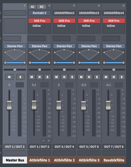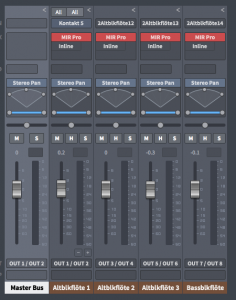 - Pro benötigtes Kontakt-Instrument einen Bus anlegen (Aux-Kanal, mit Hilfe des oben zu sehenden +-Knopfes bei dem Kontakt-Instrument)